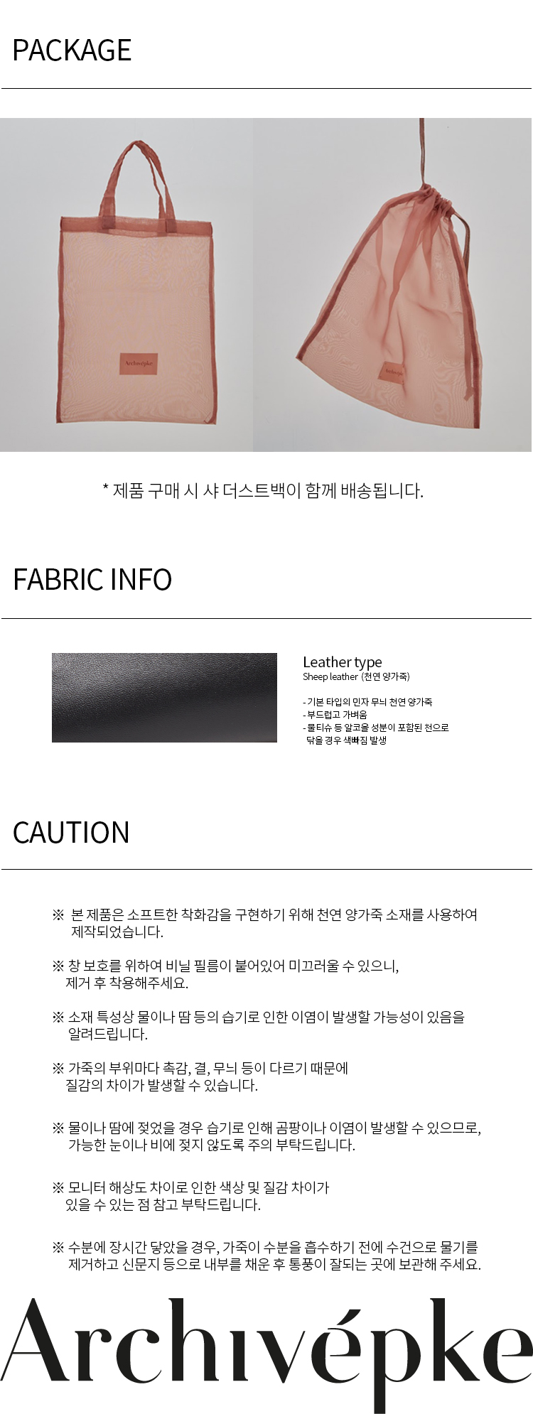 | 소재 | 외피: 양가죽 내피: 양가죽 (심지,보강재,상표,무늬,레이스,밴드 등 제외) |