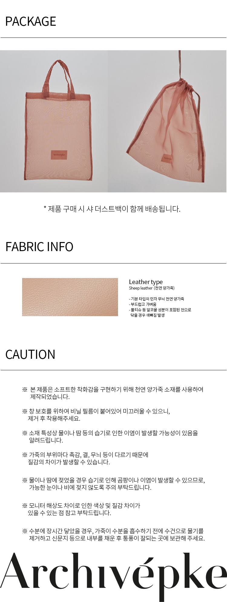 소재 | 외피: 양가죽 100% 내피: 폴리에스터 90% 스판덱스 10% 창재료: 합성고무 100% |
