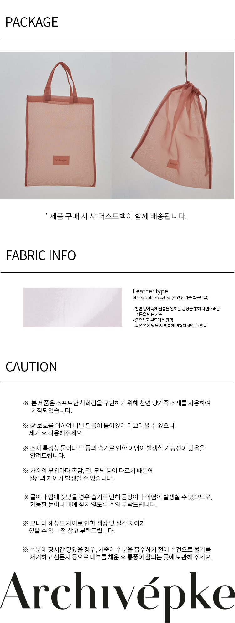 천연 가죽 제품으로 착용 및 보관시 습기나 물에 노출되지 않는 것이 좋으며, 물에 닿았을 경우 마른 수건으로 닦아주고 서늘한 곳에서 말려주는 것이 좋다.