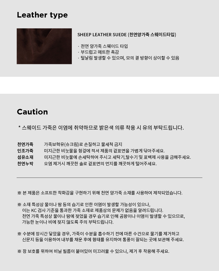소재 | 외피: 스웨이드 내피: 인조퍼 밑창 : EVA +합성고무 |