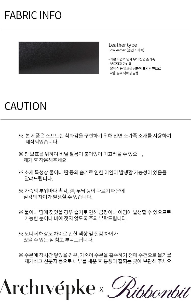 | 소재 | 외피: 소가죽 100% / 내피: 돼지가죽 100% |