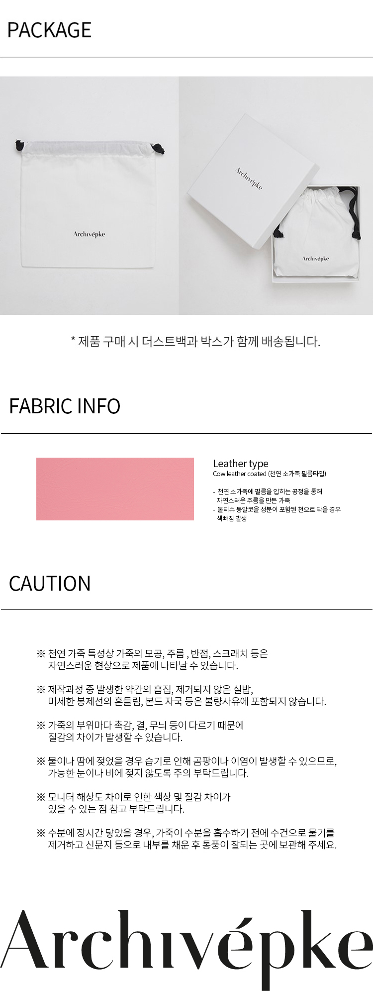 | 소재 | 외피: 소가죽 필름타입 내피: 폴리에스터 100% (심지,보강재,상표,무늬,레이스,밴드 등 제외) |
