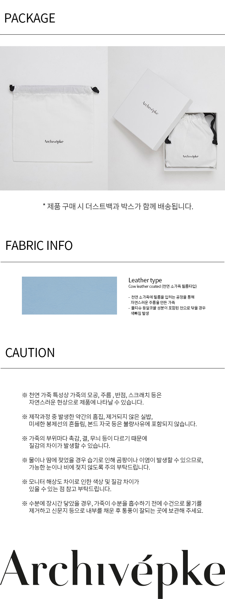 천연 가죽 제품으로 착용 및 보관시 습기나 물에 노출되지 않는 것이 좋으며, 물에 닿았을 경우 마른 수건으로 닦아주고 서늘한 곳에서 말려주는 것이 좋다.