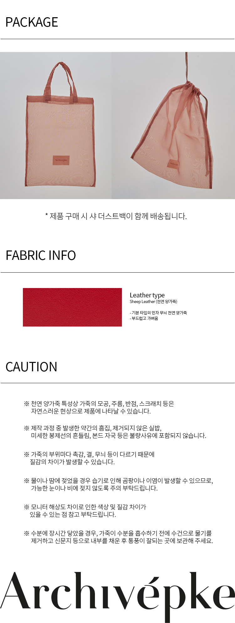 | 소재 | [CHE] 외피: 양가죽 내피: 폴리에스터 50% 나일론 50% (심지,보강재,상표,무늬,레이스,밴드 등 제외) [CRA] 외피: 소가죽 호일타입 내피: 폴리에스터 50% 나일론 50% (심지,보강재,상표,무늬,레이스,밴드 등 제외) |