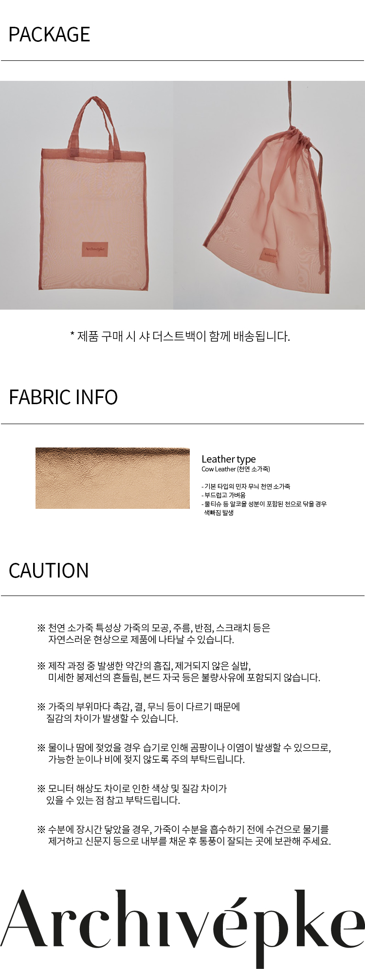 | 소재 | [CHE] 외피: 양가죽 내피: 폴리에스터 50% 나일론 50% (심지,보강재,상표,무늬,레이스,밴드 등 제외) [CRA] 외피: 소가죽 호일타입 내피: 폴리에스터 50% 나일론 50% (심지,보강재,상표,무늬,레이스,밴드 등 제외) |