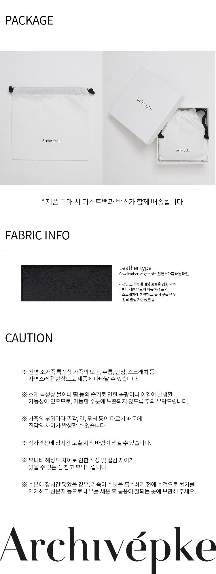• 세탁 정보 이미지천연 가죽 제품으로 착용 및 보관시 습기나 물에 노출되지 않는 것이 좋으며, 물에 닿았을 경우 마른 수건으로 닦아주고 서늘한 곳에서 말려주는 것이 좋다.