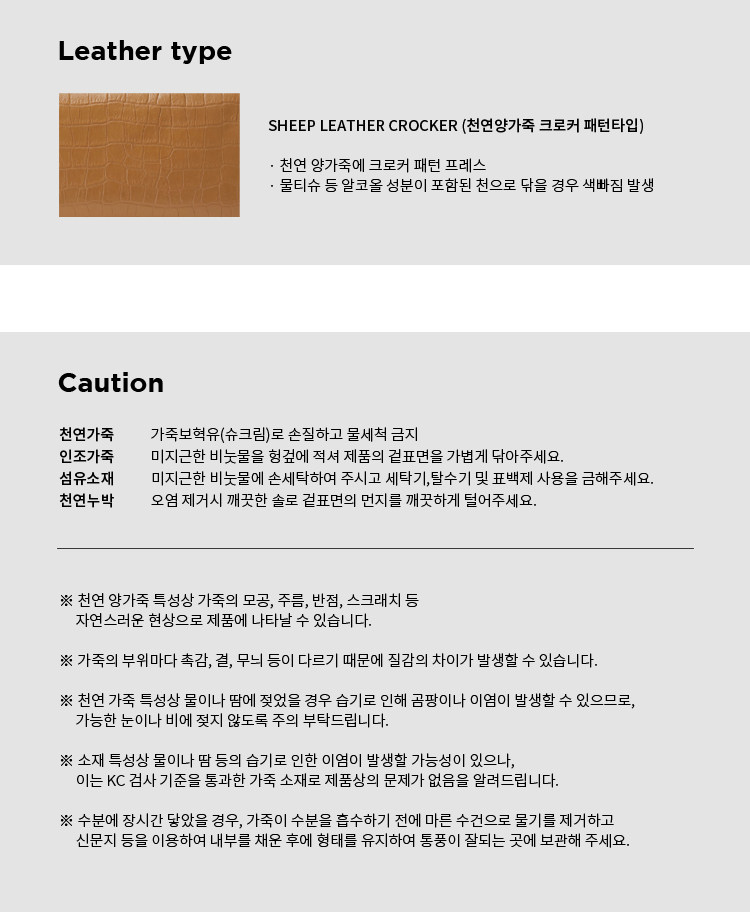 천연 가죽 제품으로 착용 및 보관시 습기나 물에 노출되지 않는 것이 좋으며, 물에 닿았을 경우 마른 수건으로 닦아주고 서늘한 곳에서 말려주는 것이 좋다.