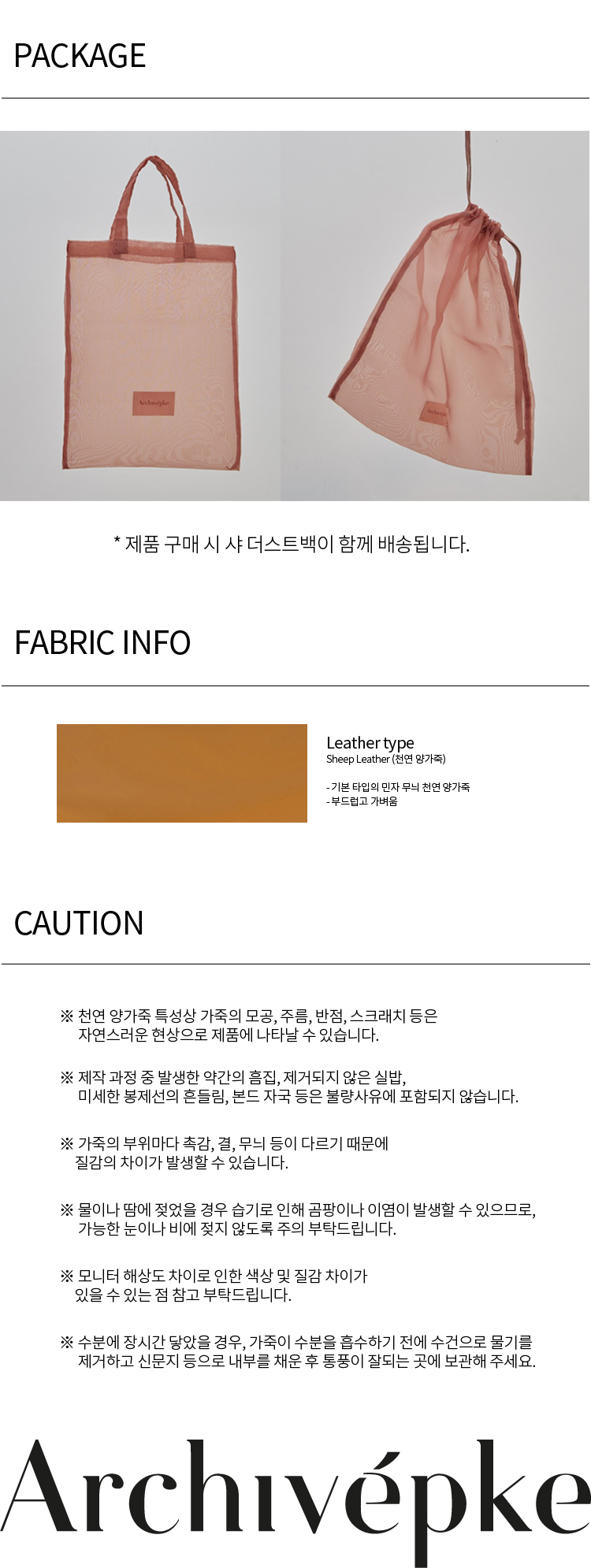 | 소재 | 외피: 양가죽 내피: 폴리에스터 100% 스트랩: 합성가죽 (심지,보강재,상표,무늬,레이스,밴드 등 제외) |