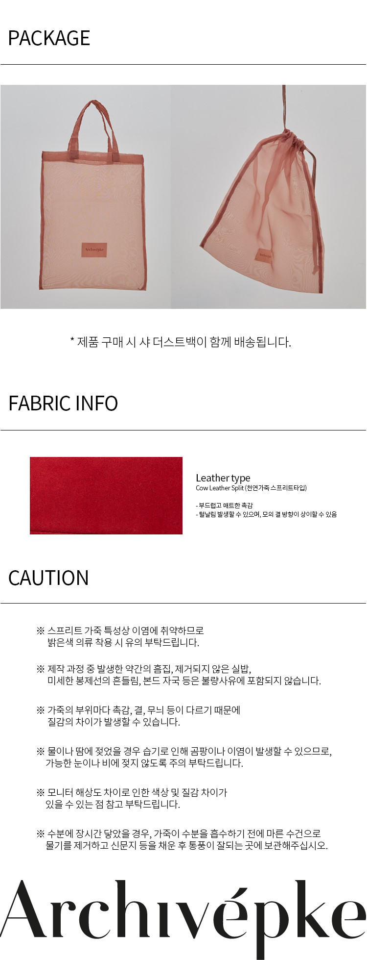 소재 | [BLK][BRW] 외피: 소가죽 100% 내피: 폴리에스터 100% 트림: 합성가죽 100% [SRD] 외피: 소가죽 스프리트타입 100% 내피: 폴리에스터 100% |