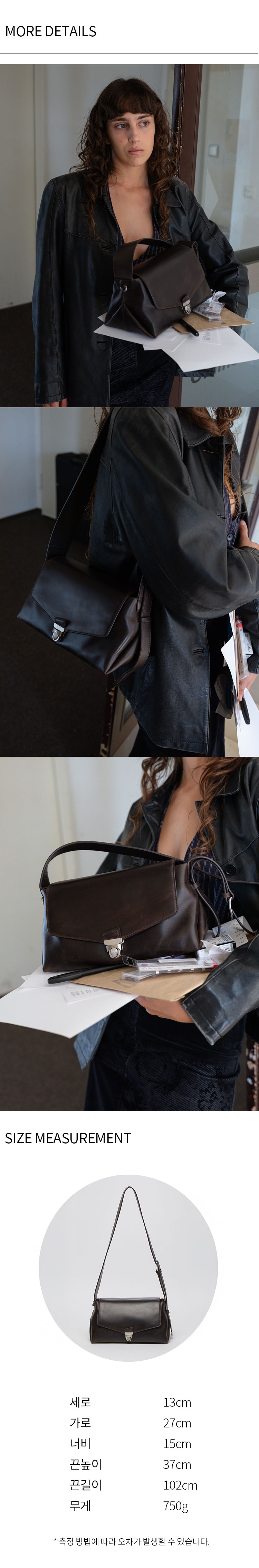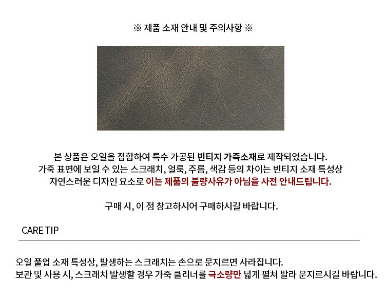 소재 | [BLK] 외피: 소가죽 100% 내피: 폴리에스터 100% 트림: 합성가죽 100% [OLB] 외피: 소가죽 베지터블타입 100% 내피: 폴리에스터 100% 트림: 합성가죽 100% |
