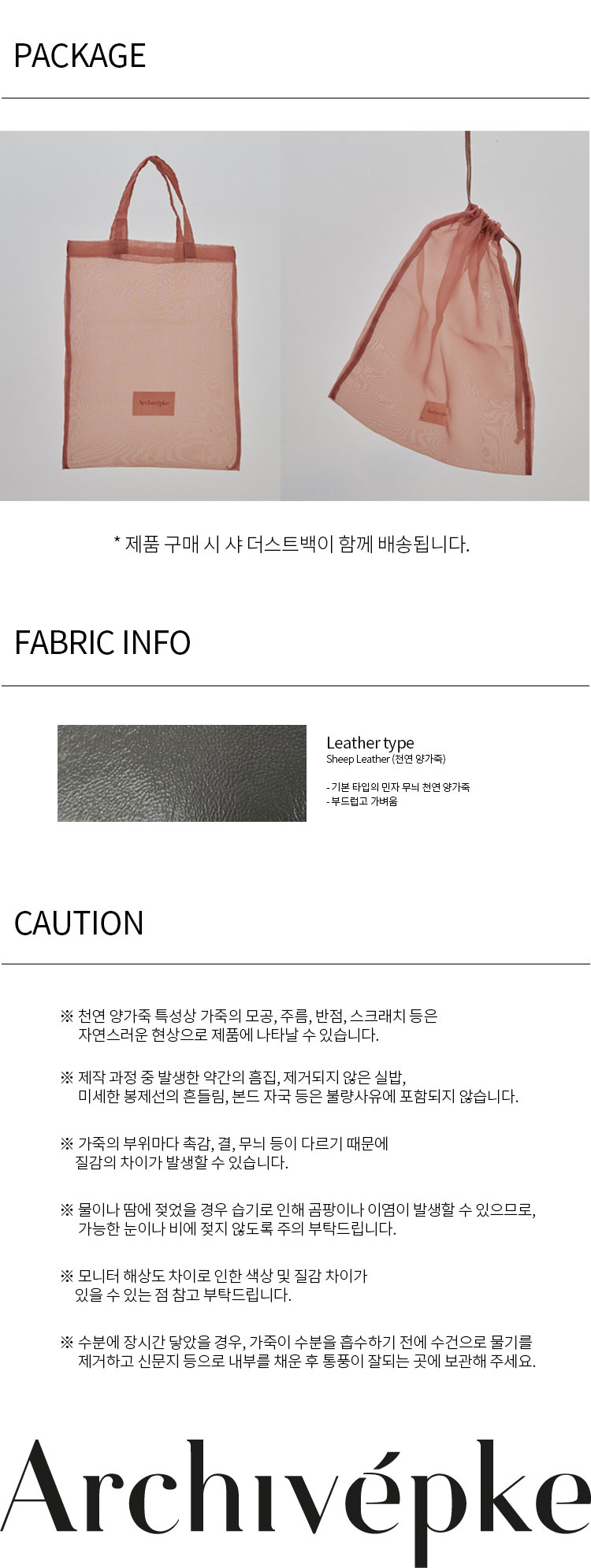• 세탁 정보 이미지천연 가죽 제품으로 착용 및 보관시 습기나 물에 노출되지 않는 것이 좋으며, 물에 닿았을 경우 마른 수건으로 닦아주고 서늘한 곳에서 말려주는 것이 좋다.