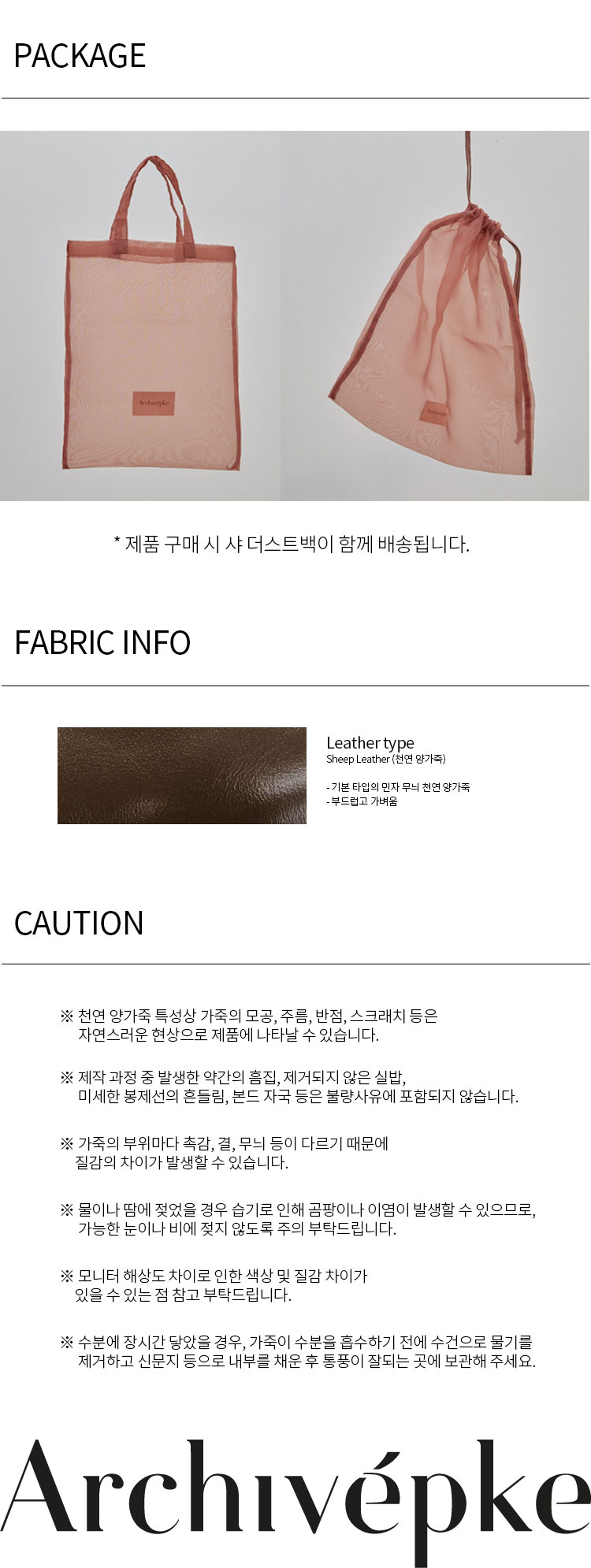 천연 가죽 제품으로 착용 및 보관시 습기나 물에 노출되지 않는 것이 좋으며, 물에 닿았을 경우 마른 수건으로 닦아주고 서늘한 곳에서 말려주는 것이 좋다.