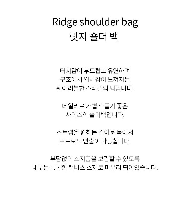 | 색상 | 스웨이드 블랙, 스웨이드 크림, 스웨이드 브라운, 글로시크랙버건디, 딥 슬립, 글로시 크랙 카멜, 글로시 아이비 그레이, 밀크 브라운, 올리브 베이지 |