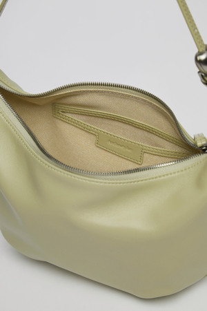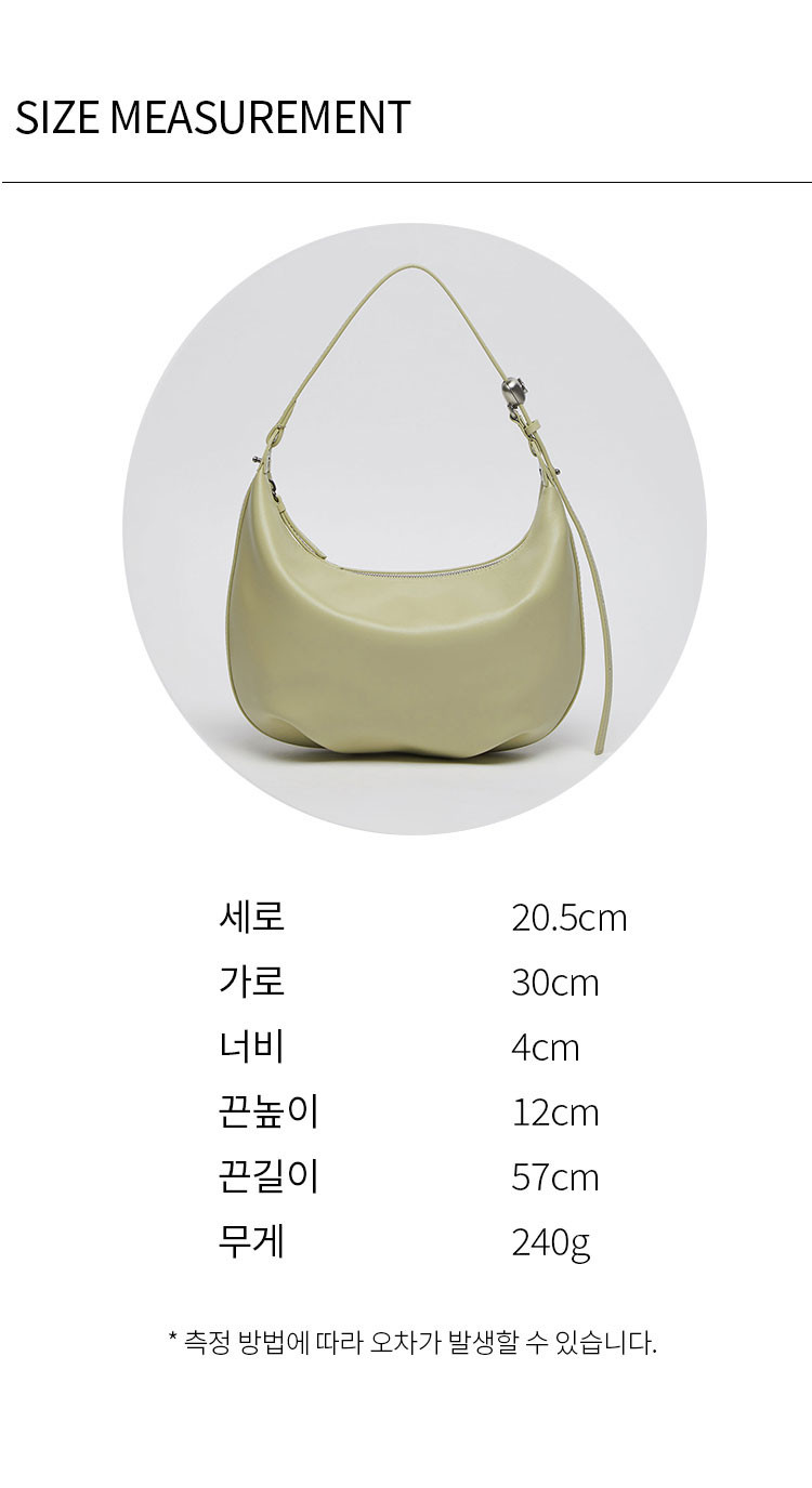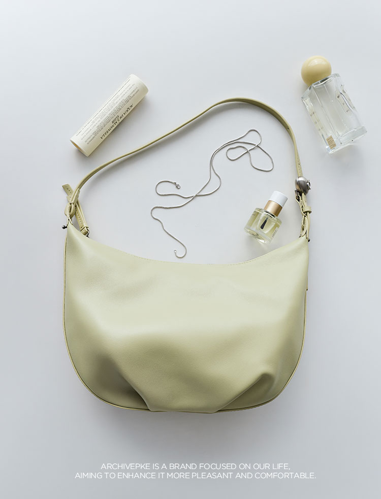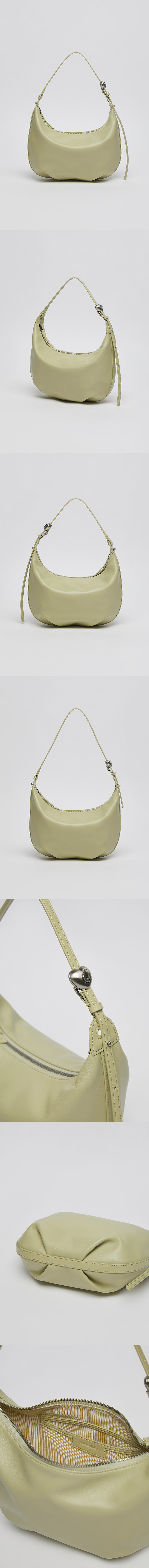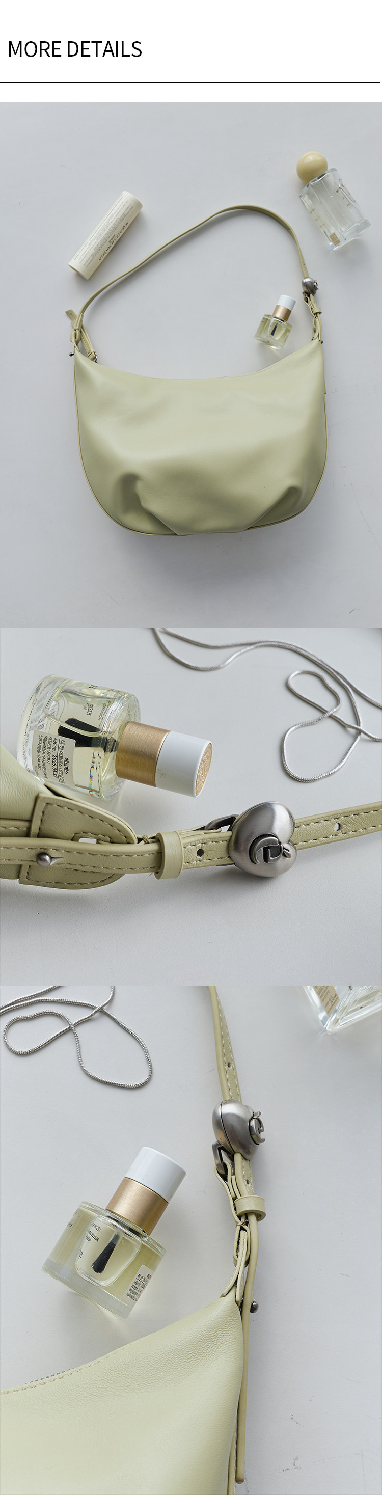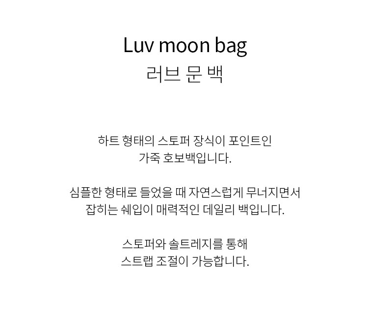 하트 스토퍼 장식이 포인트인 가죽 호보백입니다. 심플한 디자인에 자연스럽게 무너지는 쉐입이 매력적이며, 스토퍼와 솔트레지로 스트랩 조절이 가능합니다.