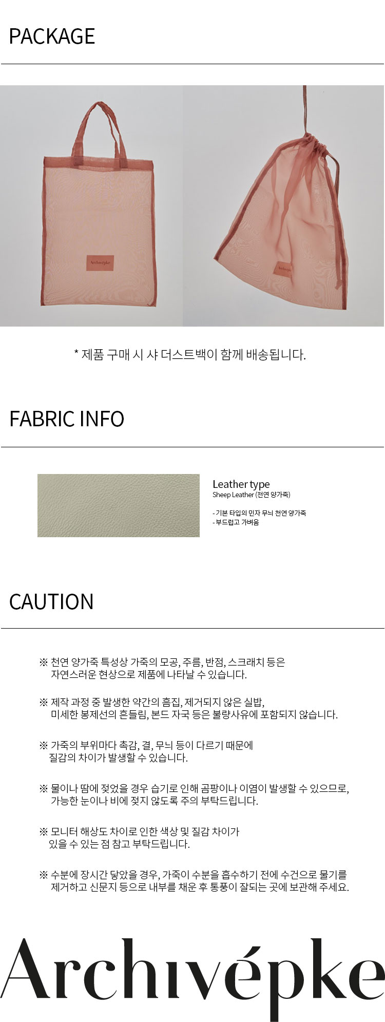 천연 가죽 제품으로 착용 및 보관시 습기나 물에 노출되지 않는 것이 좋으며, 물에 닿았을 경우 마른 수건으로 닦아주고 서늘한 곳에서 말려주는 것이 좋다.