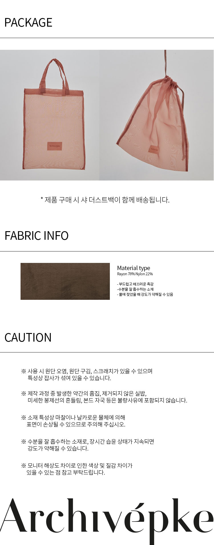 | 소재 | [BRW] [WBL] 외피: 레이온 78% 나일론 22% 트림: 폴리에스터 100% [BLK] 나일론 100% |