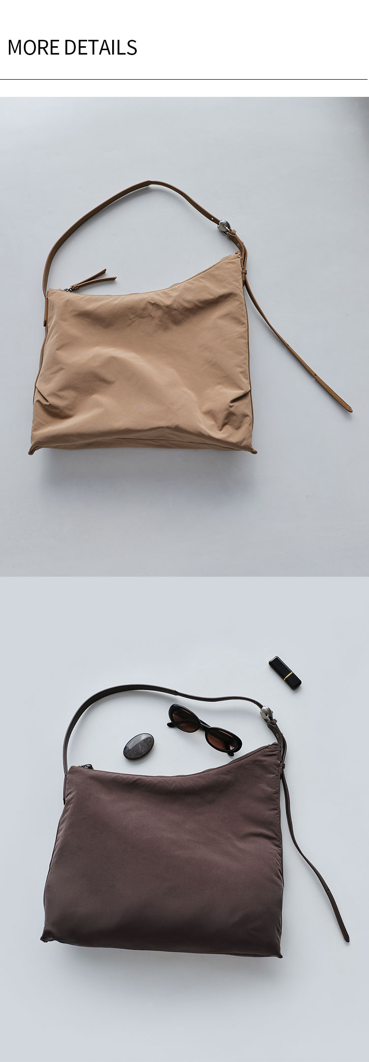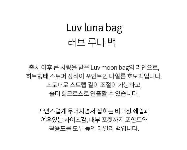 자연스럽게 무너지는 비대칭쉐입이 특징인 나일론 호보백입니다. 스트랩조절로 숄더·크로스 연출 가능하며, 하트 스토퍼 와 넉넉한 수납으로 디자인과 활용도를 모두 높인 데일리 백입니다.