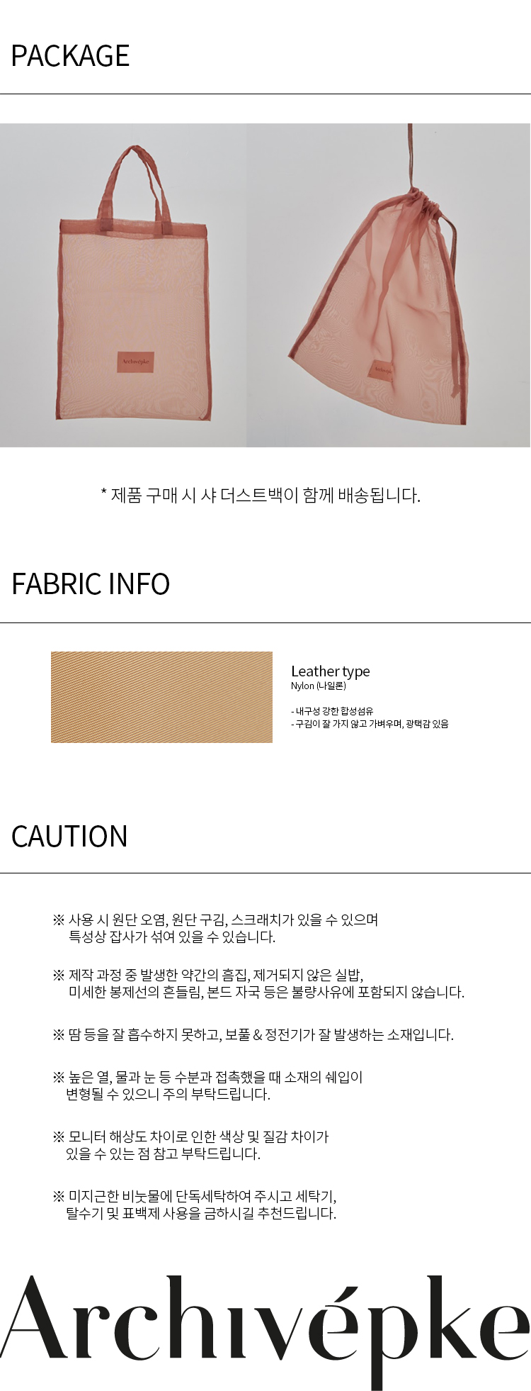 | 소재 | 외피: 나일론 100% 내피: 폴리에스터 50% 면 50% 스트랩: 합성가죽 (심지,보강재,상표,무늬,레이스,밴드 등 제외) |